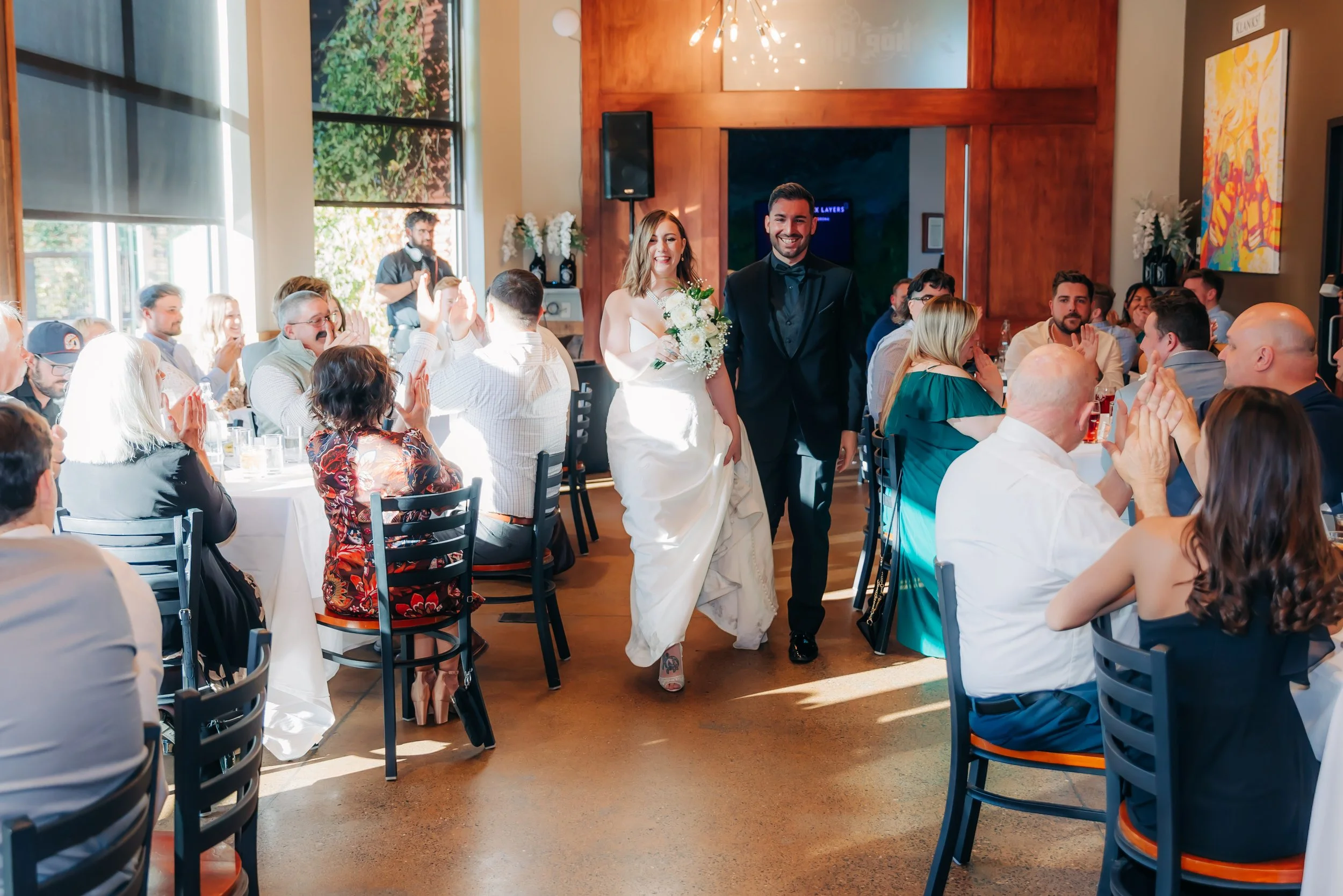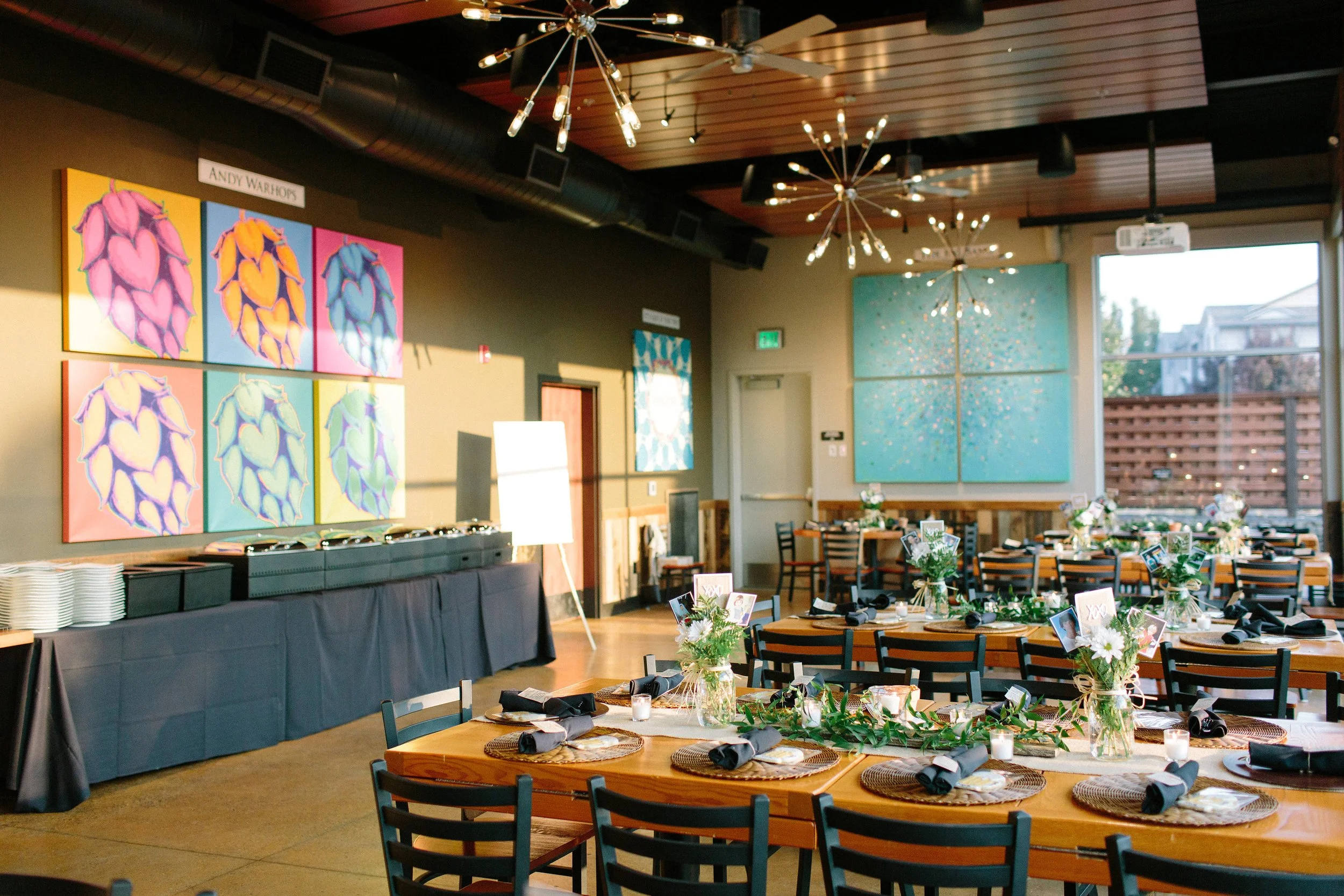 This large open room offers a host of possibilities ranging from small business presentations to intimate wedding receptions. This space is completely customizable with a portable bar and movable tables & chairs. The Hop Mahal is a fun, vibrant space that features a full AV setup, blackout screens, unique artwork & an incredible private patio.